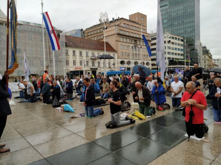 Molitvu je pratila šačica prosvjednika, koji su se pojavili sa svojim transparentima ali očito zbog kiše došli su u znatno manjem broju nego inače.