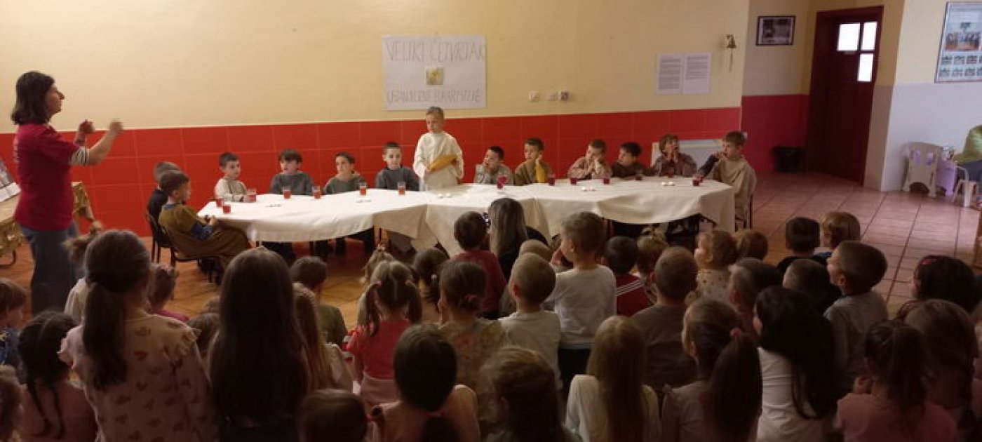 Na Veliki četvrtak djeca su se pripremala za Vazmeno trodnevlje kroz molitvu i čitanje prigodnih Biblijskih priča. Zatim su svi skupa teatralno uprizorili pravu proslavu Posljednje večere. Obukli su se u kostime apostola, zajedno su blagovali, a zatim im je „Učitelj“ oprao noge. Tako su djeca kroz konkretan primjer i uživljavanje u događaj mogla dublje i posebnije doživjeti što se to slavi kroz ovo tako važno liturgijsko vrijeme. Kroz cijeli tok Isusova ustanovljenja sakramenta Euharistije toplo su ih i lijepo uvodile tete Julia i Ružica.