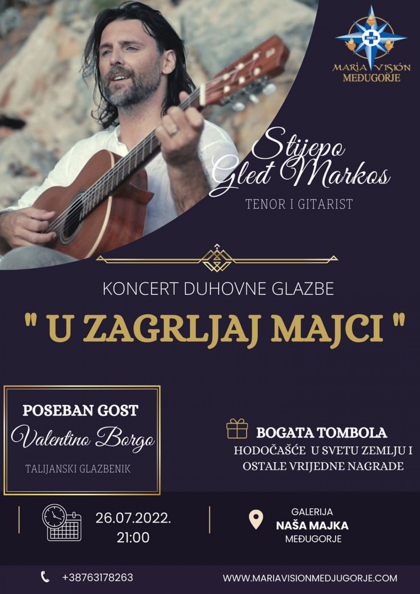 Koncert je u organizaciji Maria Vision Međugorje i muzeja Naša Majka. Poseban gost je Valentino Borgo, talijanski glazbenik, koji će nas približiti Bogu kroz izvedbe duhovnih pjesama na više jezika. Također, dolazi nam gost iznenađenja čiji talent nikoga neće ostaviti ravnodušnim.